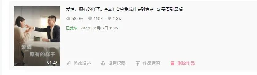 板川官方抖音號【板川美食廚房】,不僅在開播短短一周內(nèi)就突破30萬的播放量,在開播三個月后《愛情原有的樣子》的單條視頻播放量也突破了56萬!并且各項(xiàng)數(shù)據(jù)還在持續(xù)上漲中!