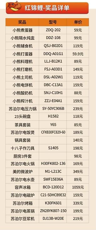 容聲冰箱、蘇泊爾烤箱、微波爐、電壓力鍋、電磁爐、電飯煲、點火鍋、榨汁機、攪拌機(禮品多到數不完)!