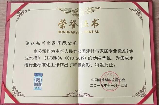 會議上主編單位、評審組組長代表發言,對標準編制說明匯報及逐條講解,五位評審專家現場審查并投票表決,授予參編單位標準正式編號后,現場頒發證書。板川作為中華人民共和國建材與家居專業標準《集成水槽》(T/CBMCA 0010-2019)的參編單位,榮獲中國建筑材料流通協會頒發的榮譽證書。