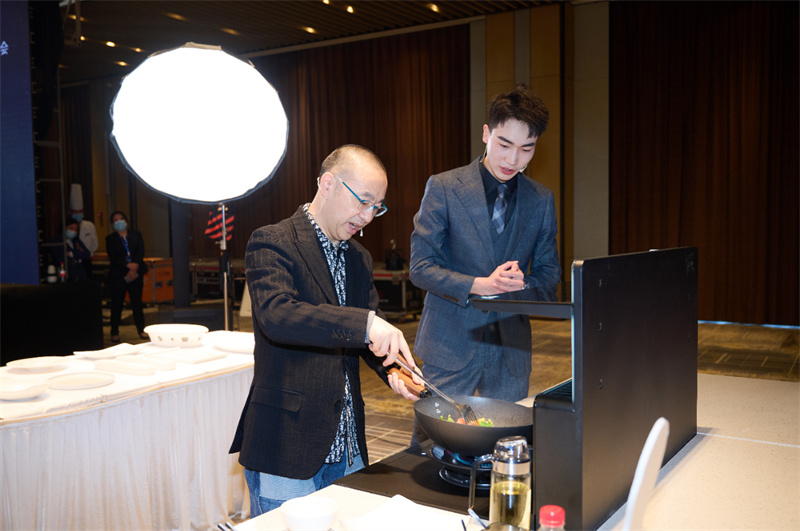 在現(xiàn)場(chǎng)搭載的實(shí)景廚房中,美食大咖劉儀偉著正裝炒菜,完全不用擔(dān)心衣服、手等被油煙污染,這份優(yōu)雅和自信來(lái)自K7蒸烤獨(dú)立集成灶AI數(shù)字智煙系統(tǒng)。