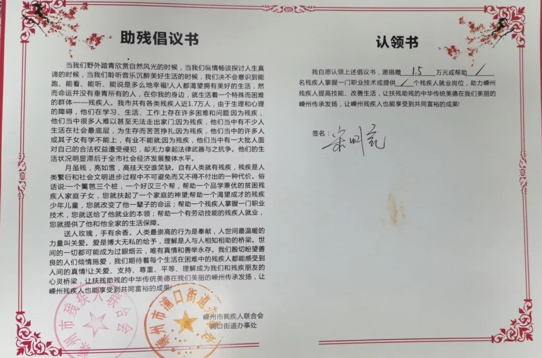 為積極弘揚中華民族扶弱助殘的美德,進一步關愛和提升殘疾人生活水平,倡導扶殘助殘的社會責任,浙江板川電器有限公司積極響應參與嵊州市殘疾人聯合會、浦口街道辦組織的“夏日送清涼”公益活動,公司董事長宋明亮先生簽署助殘倡議書和結對扶弱助殘認領書。